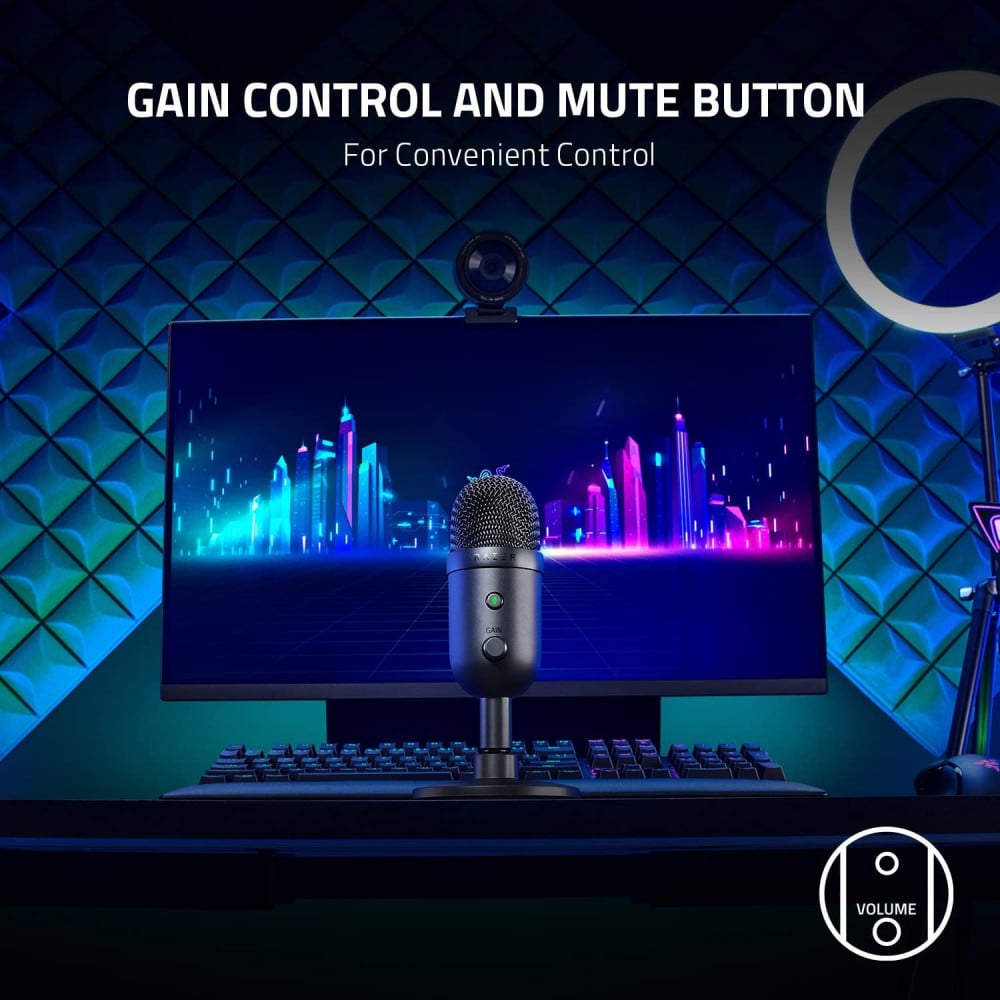 - Built in Shock Absorber: When accidental knocks and bumps occur, the Razer Seiren V2 X is able to dampen these vibrations so anyone listening is protected anst potentially loud, jarring noises.n Control and Mute Button: Adjust the Razer Seiren V2 X's general audio settings quickly and easily with a set of easy access volume, mic n, and mic mute buttons located on the mic itself