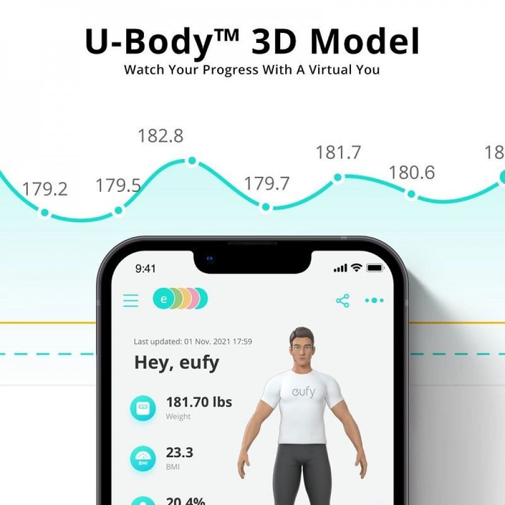 - نموذج افتراضي ثلاثي الأبعاد: شاهد تقدم جسمك خلال رحلة لياقتك مع تحليلات البيانات اليومية ونموذج افتراضي ثلاثي الأبعاد U-Body ™.
