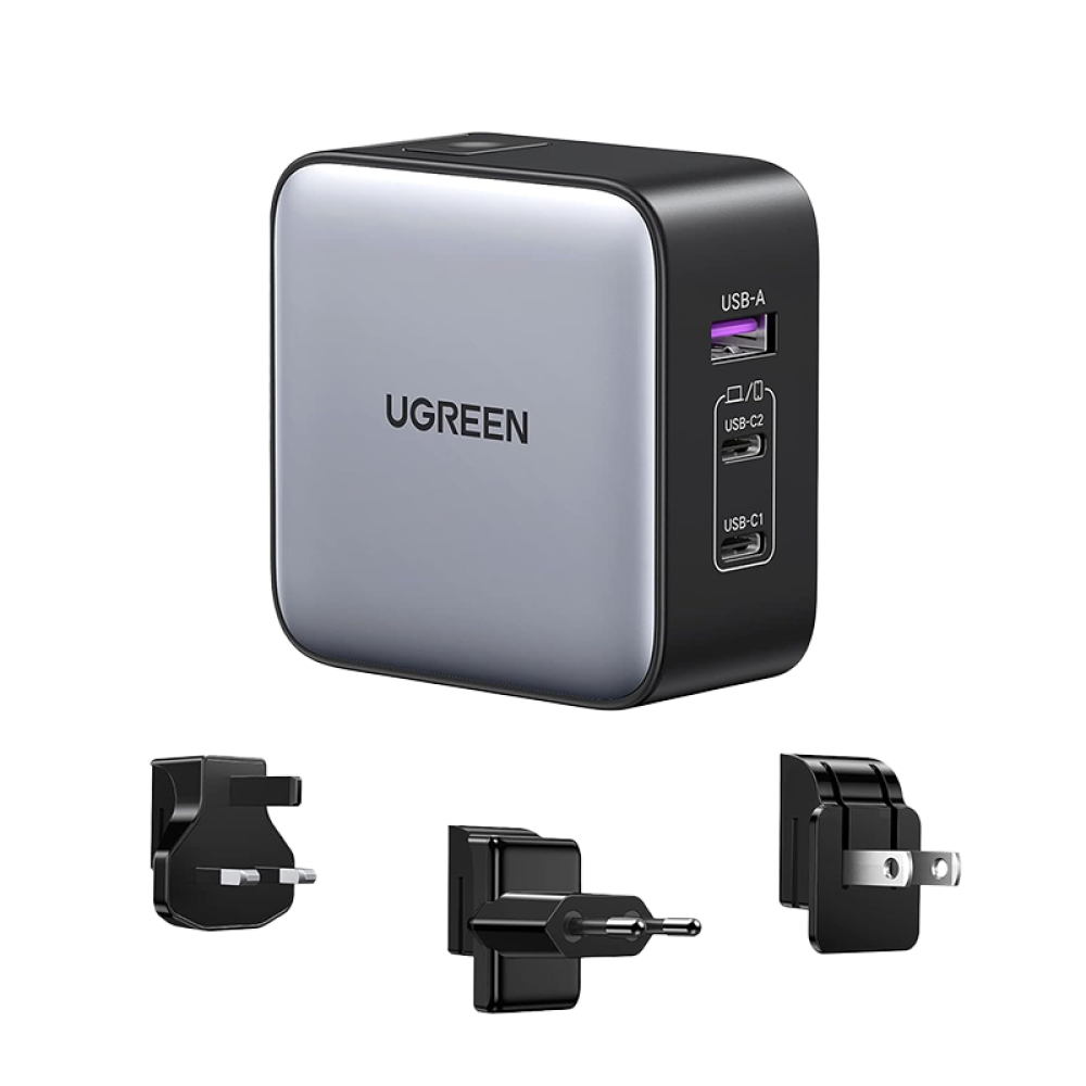 شاحن يوجرين جداري 65 واط مدخلين بتقنية PD ومدخل USB - بمقابس مختلفة للسفر