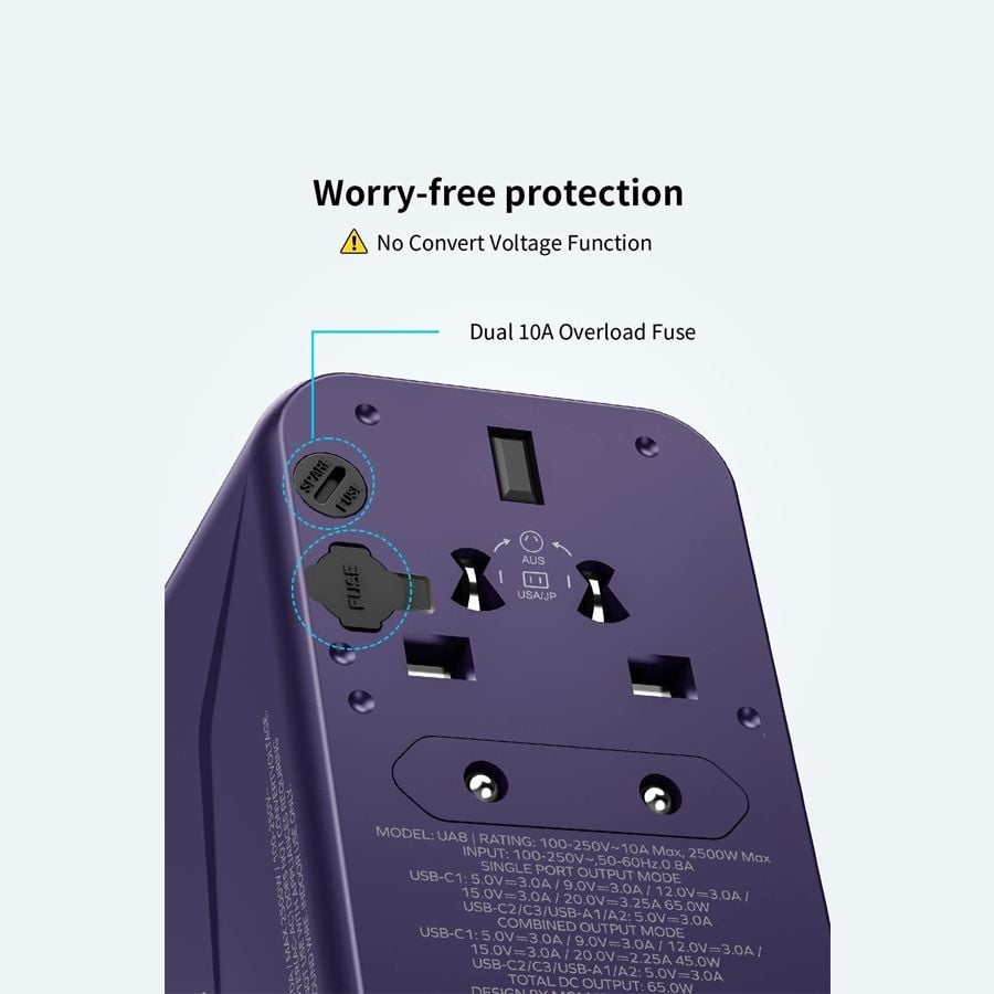 - مقبس متعدد: JP/US، AU، EU، UK تنطبق على أي وجهات السفر